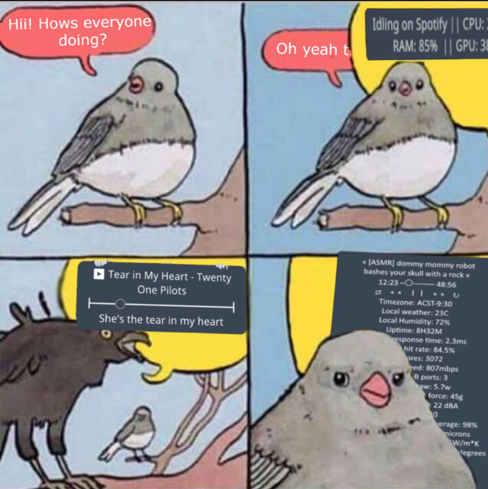 Personally, I would love to constantly know what you're listening to and seeing your RAM usage is super useful for knowing if you might be lagging out! I would love to see this over people, yk, like, talking? Communicating? (obviously sarcasm) This is so annoying, I'm going to put it into a meme format to let you know how I personally feel if someone in a convo misuses Chatbox.